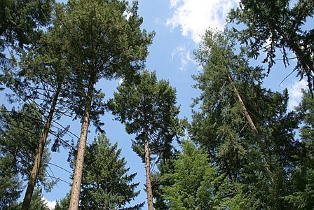 - Die Tanne war auch bei der vorliegenden Freiflächensituationen gut geeignet. Es traten weder Frostschäden noch Lausbefall auf. Stattdessen wurden massive, illegale Reisigentnahmen beobachtet, die bei vielen Jungtannen zu reduzierten Kronen und daraus folgend zu Zuwachsverlusten führten. Dementsprechend war die mittlere Höhe der Oberschichtbäume nach 21 Vegetationsperioden bei der Tanne mit 12 Metern etwa 2 Meter niedriger war als bei Fichte und Bergahorn (jeweils zirka 14 Meter). Aufgrund der Tendenz zur Vorwüchsigkeit der Fichte unter Freiflächenverhältnissen sollten eher trupp- bis gruppenförmige Mischungsformen zum Einsatz kommen.