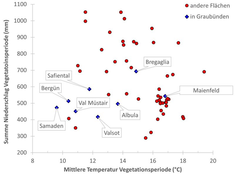 Kantonale Forstdienste, Forstbetriebe, Baumschulen und Forschende der WSL haben zwischen Herbst 2020 und Frühjahr 2023 in der Schweiz ein Netzwerk von 57 Versuchsflächen zukunftsfähiger Baumarten geschaffen. Mehr als 55 000 Bäumchen (18 Baumarten aus jeweils sieben verschiedenen Herkünften, verteilt über alle biogeographischen Regionen und Höhenstufen) werden über mehrere Jahrzehnte beobachtet und liefern Informationen zur Eignung der Baumarten im Klimawandel. Das Testpflanzungsnetzwerk – zur Zeit der umfangreichste Pflanzversuch in Europa – ist eine einzigartige Infrastruktur für Forschung und Praxis und offen für weitere Ideen und Projekte. Die Versuchsflächen decken dabei einen sehr grossen Gradienten an Klimabedingungen (warm-trocken, warm-feucht, kalt-trocken) und Bodeneigenschaften ab (Abb. 3, Details in der Originalpublikation).