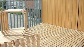 Fig. 6. Le bois en aménagement extérieur: cette façade résistante aux intempéries et aux UV présente un système de revêtement spécial à base de cellulose microfibrillée, matériau de renforcement et de support pour des substances actives. Les fissures sont moins nombreuses et la façade est protégée des micro-organismes. Les meubles du balcon sont constitués d’un nouveau matériau en composite de bambou. Photo: Doris Hölling (WSL)
