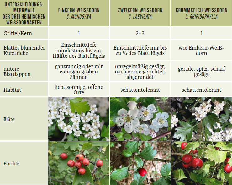Abb. 3: Unterscheidungsmerkmale der drei heimischen Weißdornarten. Foto: BFW