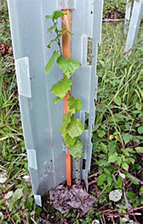 Abb. 6. Die Kombination von Wuchshülle und Mulchplatten verhindert das Hochwachsen von Begleitwuchs und hat sich in Lich sehr bewährt. Foto:Eckhard Richter