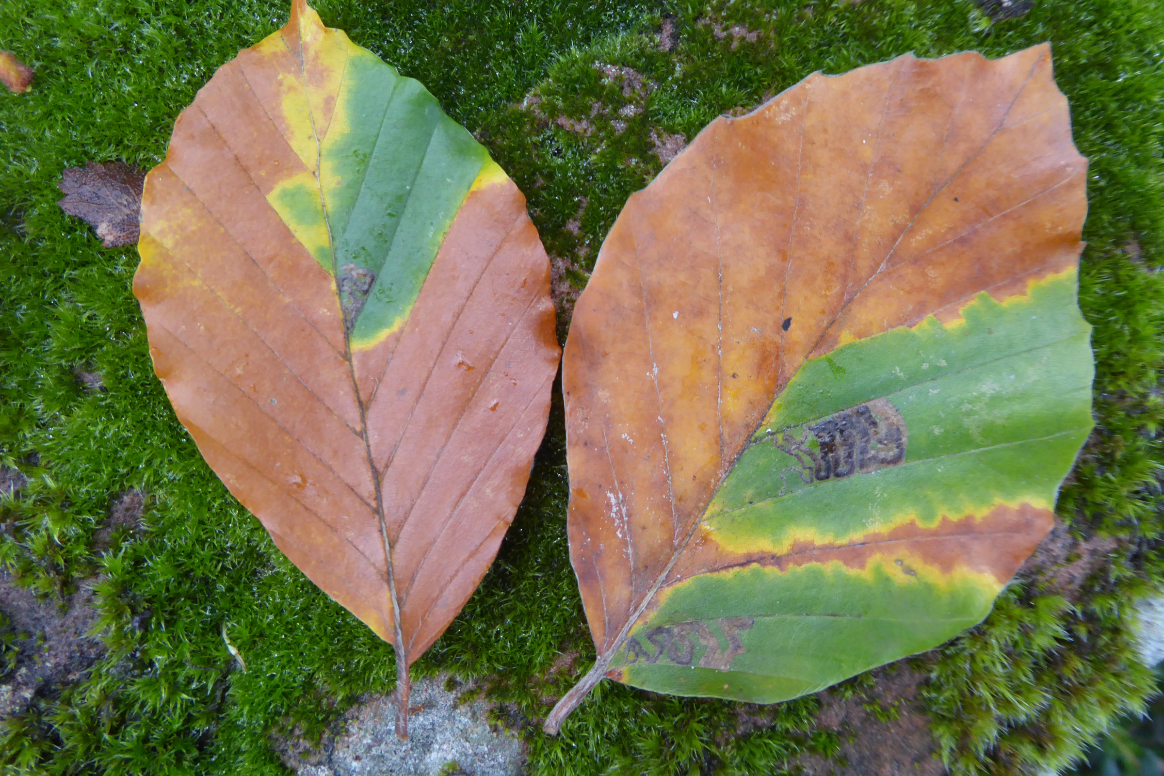 Doch wo liegt die Ursache? Meist handelt es sich um einen Befall von im Blatt minierenden Insektenlarven, z.B. Miniermotten. Diese unterbrechen durch ihren Fraß die Leitungsbahnen im Blatt und der Baum kann aus diesen Blattbereichen das Chlorophyll nicht mehr abbauen. Außerdem führt der Befall durch Pilze, Bakterien und minierende Insektenlarven zu einer erhöhten Cytokinin-Ausschüttung. Das ist ein Pflanzenhormon, das der Blattalterung entgegenwirkt. Damit stehen den Schaderregern im Blatt die dortigen Nährstoffe noch länger zur Verfügung. Auch die Gallbildner auf Blättern, z.B. die Buchengallmücke Mikiola fagi, produzieren verschiedene Phytohormone, so z.B. Auxine und cytokininähnliche Substanzen, die bewirken, dass benachbartes Pflanzengewebe verzögert altert, was sich in den grünen Blattinseln im verfärbten Herbstlaub zeigt und der Entwicklung der Larve in der Galle zu Gute kommt.