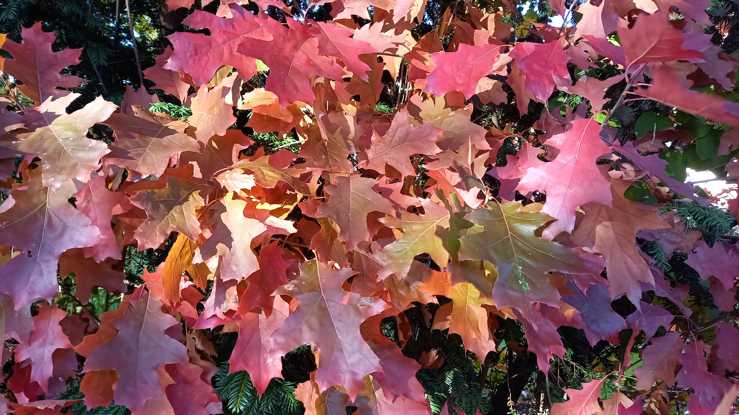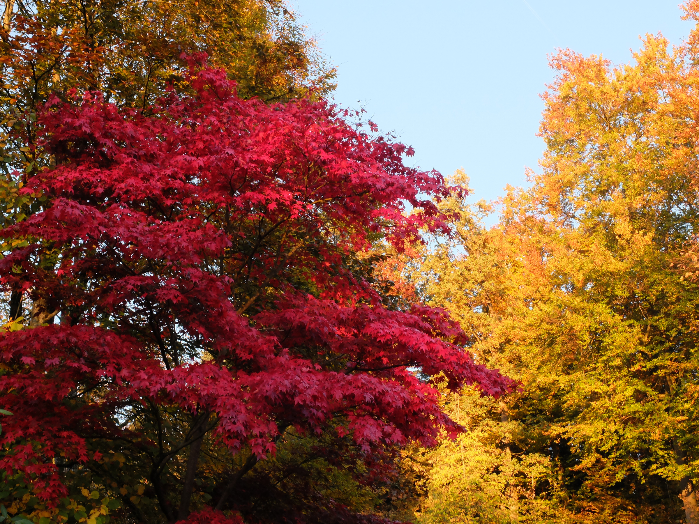 Bei unseren heimischen Laubbäumen überwiegen beim Herbstlaub gelbe oder gelbbraune Farbtöne, z.B. bei Hainbuche, Sommer- und Winterlinde, Birke, Pappel, Bergahorn. Oftmals zeigen Spitzahorn, Elsbeere und Vogelkirsche mit gelben, orangen und roten Farbtönen eine sehr eindrucksvolle Laubfärbung. Fast erreicht der Spitzahorn hier die Farbpalette des für seine Herbstfärbung berühmten amerikanischen Zuckerahorns (Acer saccharum). Auch die aus Nordamerika stammende Roteiche (Quercus rubra) fällt durch ihre intensive rote oder rotviolette Herbstfärbung auf (Abbildung 1). Noch intensiver rot verfärben sich die verwandten nordamerikanischen Eichenarten, Scharlacheiche (Quercus coccinea) und Sumpfeiche (Quercus palustris).