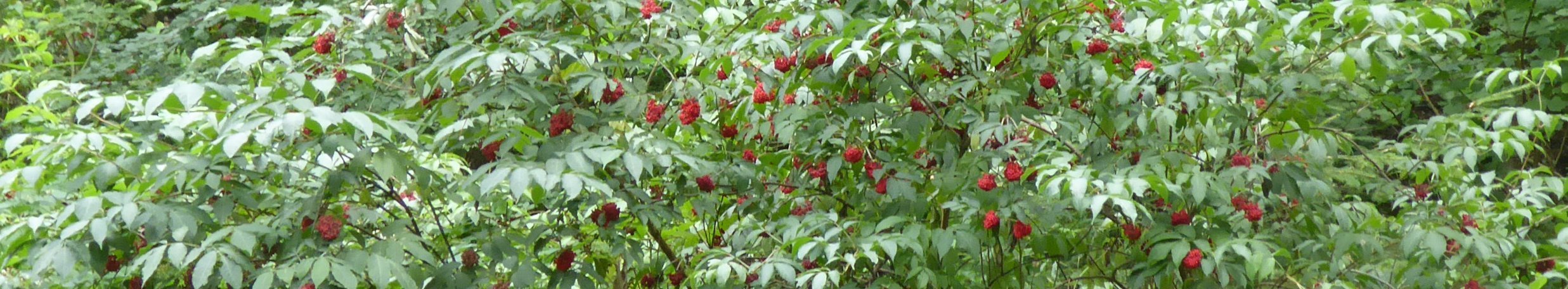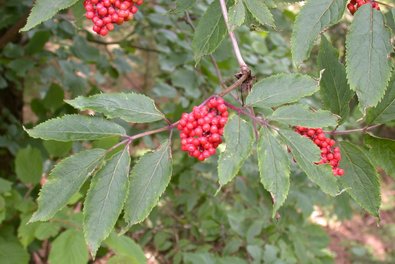 Abb. 4: Die korallenroten Früchte des Traubenholunders reifen ebenfalls sehr früh, meist bereits im Juli und August. Foto: Gregor Aas