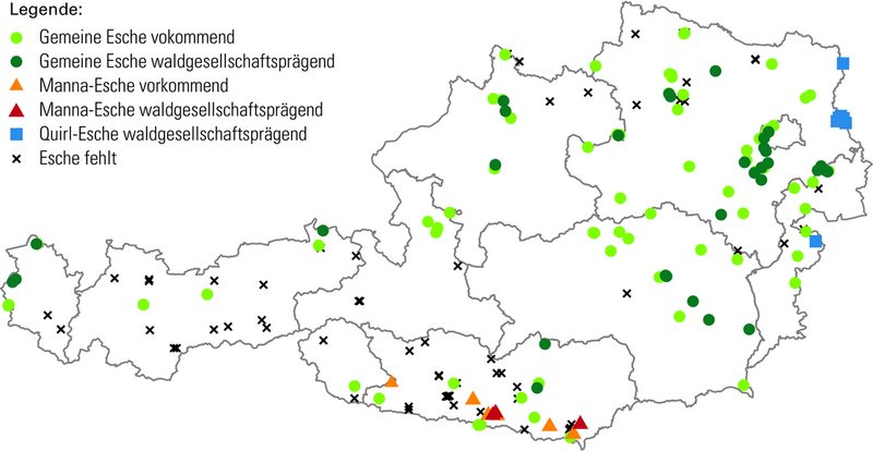 Abbildung 1: Vorkommen der heimischen Eschenarten in Naturwaldreservaten. Vereinzeltes gemeinsames Vorkommen von Gemeiner Esche und Quirl-Esche wurde letzterer zugerechnet (Quelle: BFW)