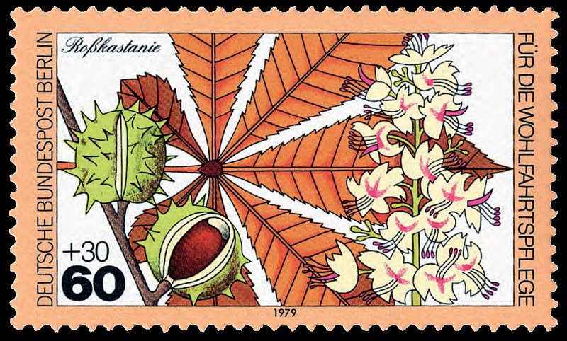 Abb. 4 - Dank der Vielfalt der grafischen Gestaltungsmöglichkeiten sind Briefmarken oft ausgereifte Kunstwerke und enthalten Botschaften auf kleinster Fläche. Die charakteristischen Merkmale der Rosskastanie: die 20 bis 30 cm grosse, aufrecht stehende "Blütenkerze", die 25 cm langen und bis zu 10 cm breiten, fünf- bis siebenfach handförmig geteilten herbstlich gefärbten Blätter sowie die 1 bis 3 cm grossen "kastanienbraunen" Samen in ihrer grünen, stacheligen Schale. Foto: Koni Häne