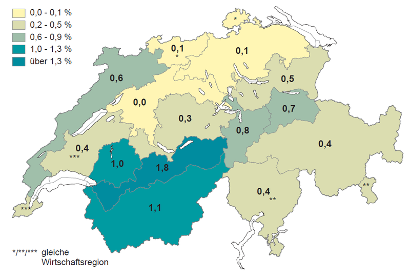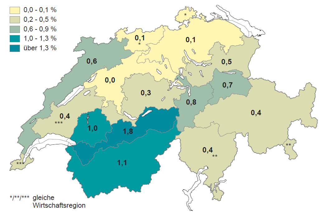 In den niederschlagsarmen Gebieten der Regionen Jura und Mittelland ist sie allerdings selten anzutreffen oder fehlt kleinräumig, etwa bei Basel oder in Tieflagen des westlichen Mittellandes (Abb. 2). Die Hauptverbreitung liegt in den westlichen und zentralen Gebieten der nördlichen Randalpen und des Juras sowie im Unterwallis. Am grössten ist der Anteil der dickeren Vogelbeeren (BHD ≥ 12 cm) in den westlichen Alpen mit 1,8 % (Abb. 3).