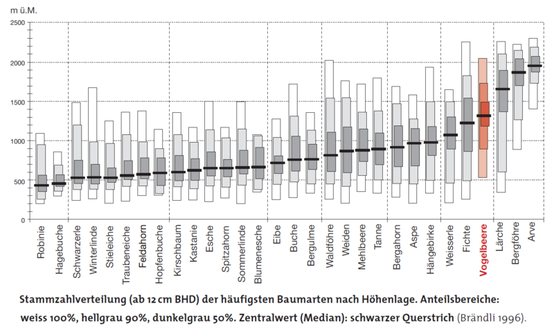 Vogelbeerbäume wachsen zu 90 % in der oberen Montan- und der unteren Subalpinstufe, die Hälfte der Bäume oberhalb von 1300 m ü. M. (Abb. 4). Die höchstgelegene Probefläche des Schweizereischen Landesforstinventars LFI mit Vogelbeere liegt aktuell auf 2167 m ü. M. ob Saas-Balen im Wallis. Zusammen mit der Alpenerle (Grünerle) soll die Vogelbeere bis maximal 2300 Meter steigen. Unter den Laubbäumen zeigt sie die grösste Höhenverbreitung, knapp vor Birke und Weisserle (Abb. 4). Das Vorkommen dieser lichtbedürftigen Pionierart ist weitgehend durch die Konkurrenz bedingt. Überdurchschnittlich häufig ist sie im aufgelösten Gebirgswald, im plenterartigen und ungleichförmigen Hochwald, im Jungwuchs und im lückigen, gleichförmigen Hochwald.