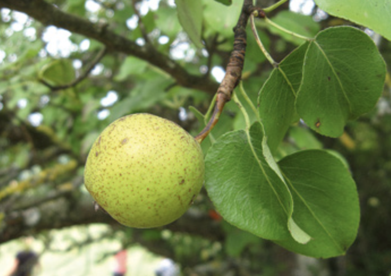 Abb. 4 - Die Frucht der Wildbirne ist klein und rundlich. In der Farbe ist die Frucht grün, gelb bis braun, aber nie rotwangig. Aufgrund der Fruchtform besteht auch die Gefahr der Verwechslungmit dem Wildapfel. Foto: Marcus Ulber