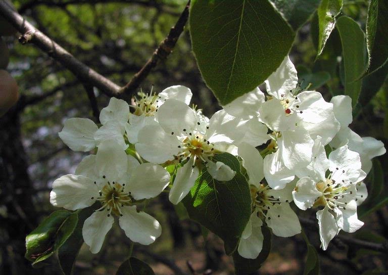 Abb. 1 - Die Blüten der Wildbirne sind kleiner als jene der Kulturfoem und häufig cremfarbig. Im unreifen zustand sind die Staubbeutel braun im Gegensatz zu den roten Staubbeuteln der Kulturform. Foto: Norbert Frank, Univ. West Hungary, bugwood.org