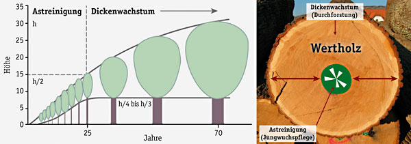 Abbildung 1: Links die richtige waldbauliche Behandlung eines Laubwertholzbaumes von der Etablierung bis zur Ernte und am rechten Bild die Wirkung auf den Holzaufbau des Blochs: kleiner Astkern – gleicher Durchmesser wie der Z-Baum zum Zeitpunkt der Erstdurchforstung – umgeben von einem breiten astreinen Gürtel.