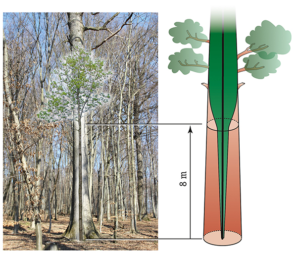 Die Äste sind im Idealfall bis zur erwünschten Höhe am Stamm (je nach standörtlicher Wuchsleistung und Betriebsziel 5 – 10 m) abgestorben und teilweise abgefallen. Jetzt gilt es, das Dickenwachstum des Stammes zum Aufbau des begehrten astreinen Holzmantels zu fördern. Dabei hilft uns die Tatsache, dass Kronendurchmesser und BHD des Baumes in einer engen funktionalen Beziehung zueinander stehen. Mit der Eingriffsstärke und den Durchforstungsintervallen steuert der Waldbauer über die Standraumgestaltung die Kronengröße des Baumes und damit sein Dickenwachstum.