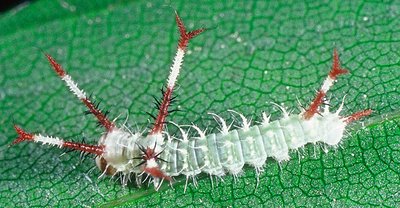 Auch die Raupen des Nagelflecks (Aglia tau) entwickeln sich an Lindenblättern. Seine Raupen sind im ersten Stadium mit skurrilen weiß-roten Hautauswüchsen sehr auffällig gestaltet (Abb. 2).