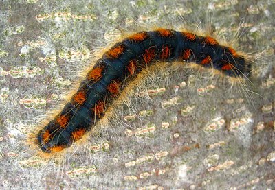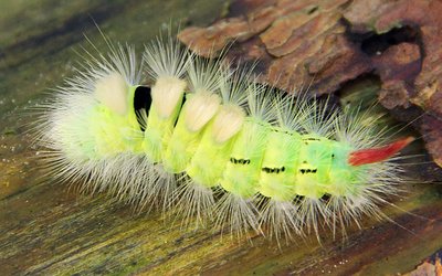 Der Buchenrotschwanz (Dasychira pudibunda) frisst ebenfalls sehr gerne an Linden. Den Namen Rotschwanz verdankt dieser als Imago unauffällige, weißgraue Schmetterling, dem Aussehen seiner Raupe: Die stark behaarte, gelbgrüne Raupe trägt neben vier gelben Haarbüscheln am Rücken noch ein rotes, pinselartiges Haarbüschel am Hinterende (Abb. 3).
