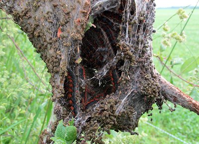 In den letzten Jahren ist der Wollafter (Eriogaster lanestris) häufiger in Erscheinung getreten (Abb. 4). Der stark behaarte Schmetterling befällt verschiedene Baum- und Straucharten, beispielsweise Weiden, Schlehen, Rosengewächse und Birken. Auffällig sind seine großen sackartigen Raupengespinste (Abb. 5), vor allem an Alleelinden.