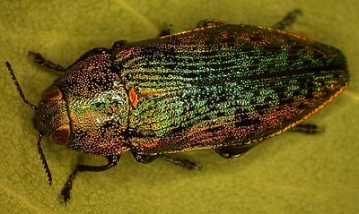 Die farbenprächtigste Art an der Winterlinde ist der über einen Zentimeter große Lindenprachtkäfer (Scintillatrix rutilans) (Abb. 10). Nachweise der wärmeliebenden Art stammen überwiegend aus Städten von einzelnstehenden Bäumen oder Alleen und nicht aus Wäldern.