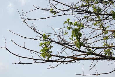 Der Triebschädling Stigmina pulvinata löst das sogenannte Lindentriebsterben aus. Befallene Kronen wirken extrem zerzaust und aufgelichtet. Der Pilz befällt und tötet fast ausschließlich dünne Zeige der Linden. Er ist anhand der schwarzbraunen Fruchtkörper auf den Trieben anzusprechen (Abb. 12). Die meisten Linden können sich über den Johannistrieb wieder weitgehend regenerieren (Abb. 13). Der Befall kann wieder sehr stark zurückgehen, auch nach Jahren.