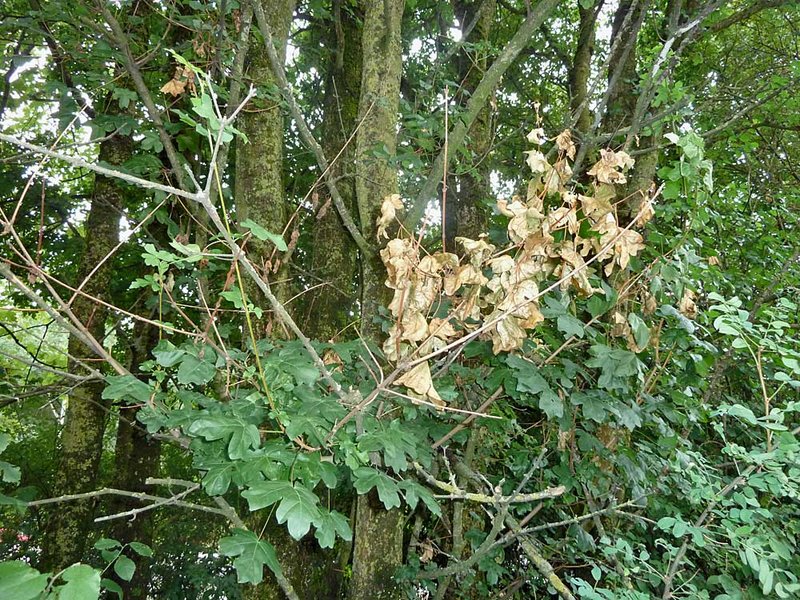 Typische Triebschäden, gekennzeichnet durch Blattwelke, Zweigsterben sowie zum Teil Rindenläsionen werden beispielsweise durch den Rotpustelpilz Nectria cinnabarina oder von Stigmina hartigiana verursacht. Ersterer ist am Feldahorn häufig entlang von Straßenböschungen (Autobahnen, Bundesstraßen) auffällig, wo die nach der Laubentfaltung in Teilen der Krone einsetzende Welke in Verbindung mit einer vorangehenden Streusalzbelastung gesehen wird (Abb. 3). Grundsätzlich liegt der parasitischen Phase des Pilzes fast immer eine abiotische bzw. anthropogen bedingte Disposition der Pflanze zugrunde, die neben einem Salzschaden auch durch Trockenstress, Sonnenbrand, Frost oder eine fehlerhafte Pflanzenbehandlung herbeigeführt worden sein kann.