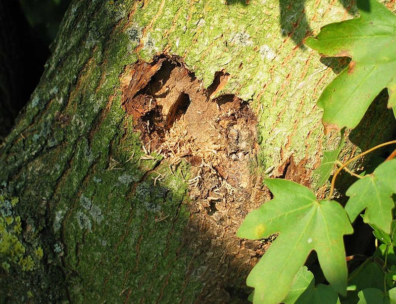 Im Jahr 2004 wurde erstmals in Deutschland der Asiatische Laubholzbockkäfer (Anoplophora glabripennis) festgestellt. Inzwischen sind insgesamt sieben Befallsgebiete bekannt. Das Wirtspflanzenspektrum des Käfers ist weit, wobei er Ahorn-Arten einschließlich A. campestre bevorzugt befällt. Der Schaden erfolgt durch die Fraßtätigkeit der Larven in Ästen und Stamm im Kronenbereich (Abb. 4). Typische Symptome sind ovale Larvengänge und kreisrunde, ca. 1 cm große Ausbohrlöcher des Käfers. Von der nahen verwandten Art, dem Citrusbockkäfer (A. chinensis), wurden in den vergangenen Jahren mehrfach Käfer an importierten Ahorn-Bäumen (Acer palmatum) gefunden, ohne dass es zu einer Ansiedlung in Deutschland kam. Beide Arten sind in der EU als Quarantäneschadorganismen eingestuft, so dass bereits der Verdacht eines Auftretens dem Pflanzenschutzdienst zu melden ist.