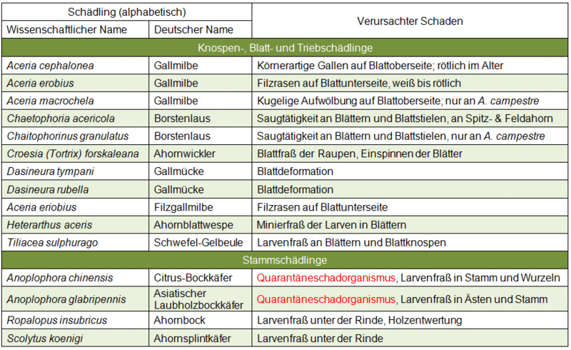 Tab. 1: Ausgewählte Schädlinge mit Bevorzugung für Feld-Ahorn