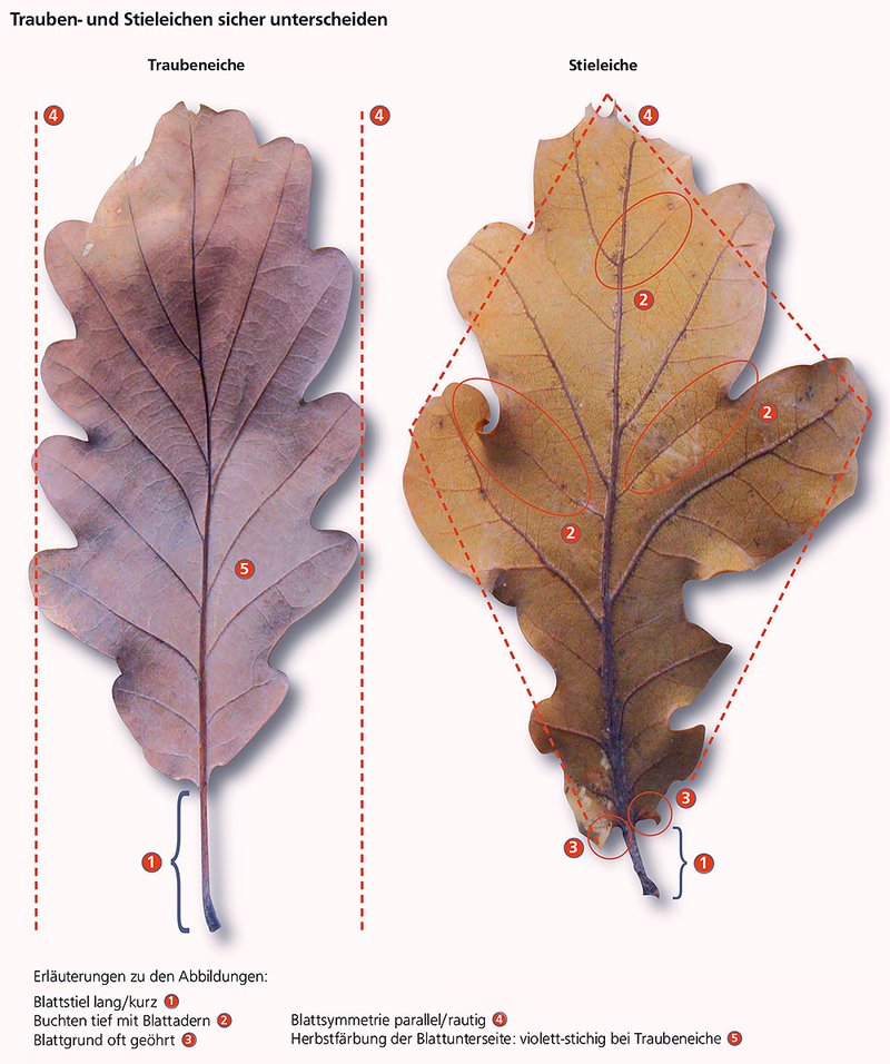 Sehr zuverlässig sind die Merkmale "Länge des Blattstiels" und "Buchten und Blattadern". Mikroskopisch ist die blattunterseitige Behaarung der Mittelrippe bei der Traubeneiche ein gutes Merkmal, das allerdings auch mit Lupe nur schwer erkennbar ist. Die Traubeneiche hat auf der gesamten Blattunterseite zusätzlich eng anliegende Sternhaare. Sogar auf mehrere Meter Distanz gut erkennbar ist die violett-stichige Färbung auf der Unterseite der vor allem frisch gefallenen Traubeneichen-Blätter. Zusätzliche, aber nicht immer zuverlässige Merkmale sind die Öhrung des Blattgrundes und die Blattsymetrie.