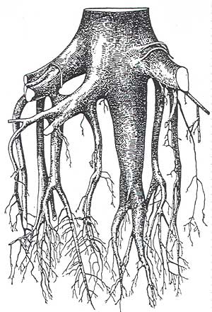 Abb. 4 - Die Weisstanne hat ein tief gehendes Wurzelsystem aus Pfahl- und Senkwurzeln (nach N. Köstler, 1986).