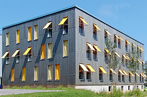 Abb. 6 - Erster Bürobau nach Minergie-P-Eco der Schweiz mit einer Fassade aus natürlich vorvergrautem Weisstannenholz. Die drei Geschosse über dem massiven Untergeschoss sind mehrheitlich in Holz erstellt. Foto: Corinne Cuendet, Clarens (LIGNUM)