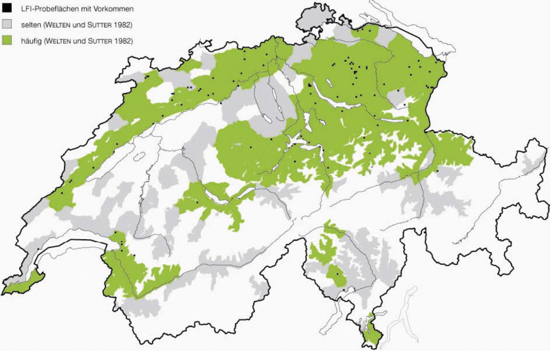Die Schweiz liegt mitten im europäischen Hauptareal der Eibe (Taxus baccata). Die bedeutendsten Verbreitungsgebiete liegen im östlichen Mittelland, im Jura, in den Randalpen zwischen Boden- und Thunersee und im unteren Rhonetal. Anhäufungen von LFI-Probeflächen mit Eibenvorkommen (Abb. 2, schwarze Punkte) sind Indikatoren für eigentliche Verbreitungsschwerpunkte. So wird mit dem LFI1 die grösste Eibendichte in der Ostschweiz in der weiteren Umgebung des Hörnlimassivs belegt.