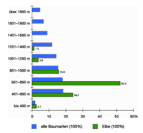 Bedingt durch ihre Winterfrostempfindlichkeit kommt die Eibe nach LFI fast nur in den kollinen/submontanen (48%) und unteren montanen (44%) Höhenstufen vor. Mehr als die Hälfte der Eiben wachsen zwischen 600 und 800 m ü. M. (Abb. 3). Der Zentralwert liegt bei 720 m ü. M., nur wenig unterhalb jenem der Buche. In der Schweiz steigt die Eibe bis auf 1400 m, im LFI liegt die höchste Fläche mit Eiben im Glarnerland auf 1250 m. Die typische Nebenbaumart gedeiht in der Schweiz zu 60% in reinen und gemischten Laubholzbeständen. Dabei sind die drei häufigsten vorherrschenden Baumarten folgende: Buche 34%, Fichte 18% und Tanne 16%.