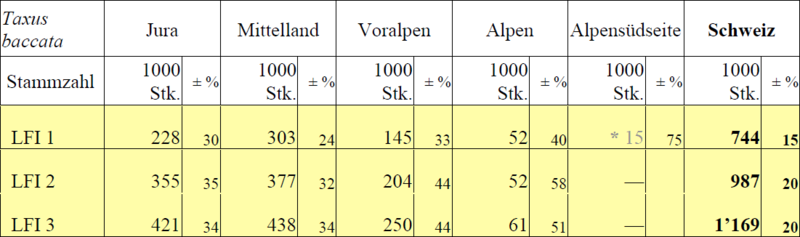 Gemäss LFI3 stehen im Schweizer Wald 1,17 Mio. (+/- 20%) Eiben mit einem Brusthöhen-Durchmesser (BHD) von 12 cm und mehr (Tab. 1). Damit nimmt die Eibe unter den heimischen Waldbaumarten vor dem Feldahorn Rang 30 ein und ist annähernd so häufig wie Spitzahorn, Zitterpappel oder Sommerlinde. Rund 2 von 1000 Waldbäumen sind Eiben, in den Regionen Mittelland und Jura sind es gar 4 beziehungsweise 5 von 1000. Am höchsten ist die Dichte im Kanton Zürich, wo fast jeder hundertste Waldbaum eine Eibe ist.