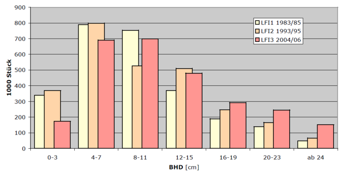 Die Problematik der fehlenden Eibenverjüngung lässt sich anhand des ersten LFI von 1985 zeitlich recht gut einordnen. Die Stammzahlverteilung LFI1 zeigt ab BHD 8 cm einen Verlauf, wie er für normale Populationen üblich ist: eine exponentionelle Abnahme mit zunehmendem Durchmesser (Abb. 6). Die Klasse 4-7 cm entspricht dieser Funktion nicht mehr und ist "untervertreten".