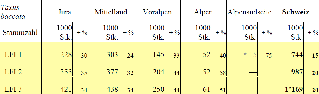 Das LFI ist zwar nicht dazu geschaffen, relativ seltene Arten wie die Eibe kleinräumig zu erfassen. Für die gesamte Schweiz sind jedoch quantitative Angaben wie Stammzahl und deren Veränderung statistisch aussagekräftig und von einer Qualität, die sich mit Umfragen nicht erreichen lässt.