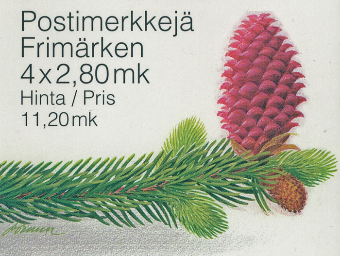 Abb. 4 - Aufrechtstehender, weiblicher Zapfenblütenstand; darunter kleine noch nicht geöffnete, männliche Blüten (Finnisches Markenheft von 1995). Foto: Koni Häne