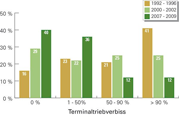 Die Schattbaumart Tanne wächst in der Jugend langsam, wird gerne verbissen, vor allem gravierend wirkt sich der Terminaltriebverbiss auf die Mischungsrelationen während der Wachstumsphasen aus. Die Daten der Österreichischen Waldinventur zeigen ein differenziertes Bild des Terminaltriebverbisses. Erhebungsflächen mit über 90 Prozent Terminaltriebverbiss der Tanne haben über die drei letzten Erhebungsperioden abgenommen (Abbildung 1).
