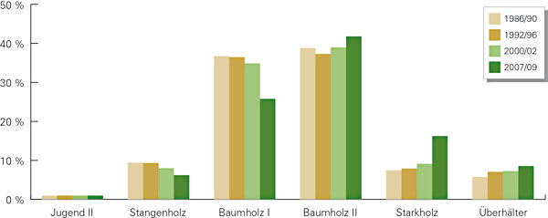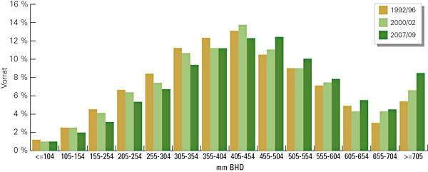 Dieses Phänomen wird noch deutlicher, wenn man die Verteilung und Entwicklung der Vorräte über die BHD-Klassen betrachtet. Dabei zeigt sich ganz deutlich die Konzentration des Zuwachses auf die starken Durchmesserklassen. Während in den BHD-Klassen bis 45 cm die Vorräte kontinuierlich abnehmen, nehmen diese in den stärkeren Durchmesserklassen noch immer zu (Abbildung 3).