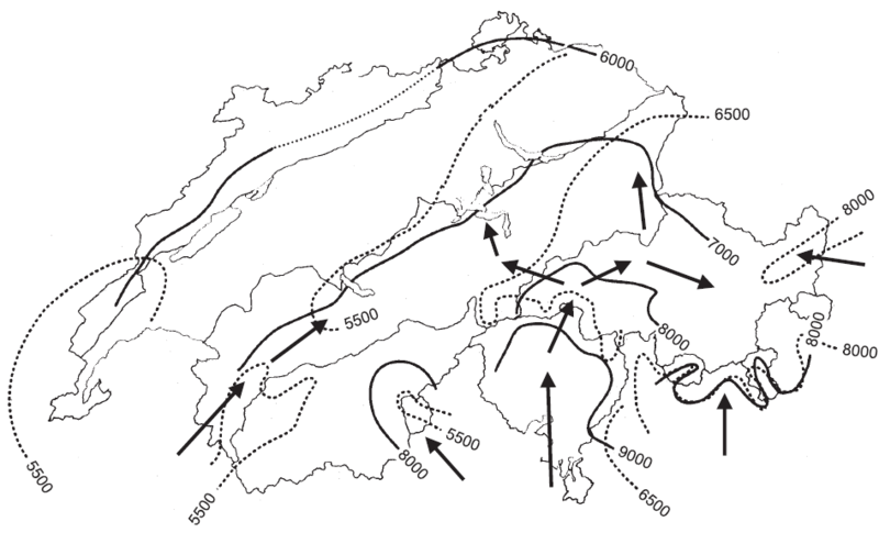 Abb. 3: Zur Einwanderungsgeschichte von Tanne (ausgezogene Linien) und Fichte (gestrichelte Linien). Isochoren in Jahren vor heute (nach BURGA & PERRET 1998).