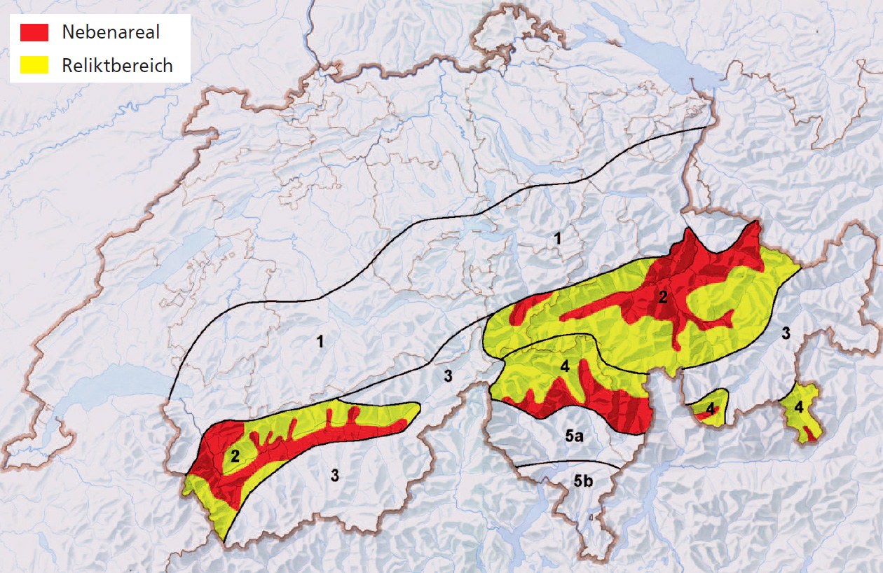 Abb. 2: Gliederung der Schweiz in die Standortsregionen (nach OTT et al. 1997) sowie Nebenareal und Reliktbereich der Tanne in den Zwischenalpen. 1: Nördliche Randalpen, 2: Nördliche Zwischenalpen, 3: Kontinentale Hochalpen, 4: Südliche Zwischenalpen, 5a: Südliche Randalpen mit Fichte, 5b: Südliche Randalpen ohne Fichte.