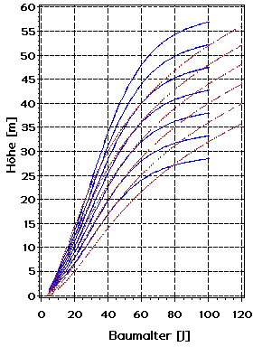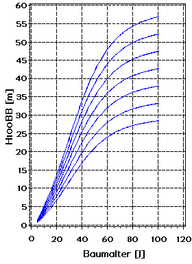 Der daraus berechnete Bonitätsfächer für Baden-Württemberg (Abb. 2) zeigt deutlich das schnelle Jugendwachstum und dessen schnelle Kulmination im Alter von ca. 25 Jahren. Im Alter von 60 Jahren sind bereits große Baumhöhen – wenn auch nur auf den besten Standorten – erreichbar.