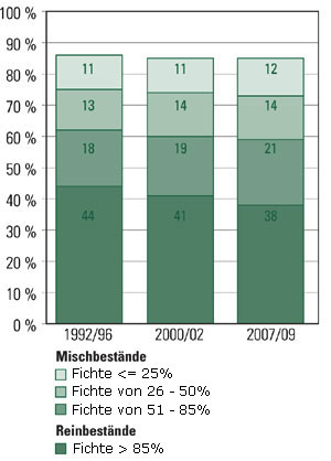 Die Fichte ist in rund 86% aller Bestände im Ertragswald zumindest als Mischbaumart vorhanden. In den letzten drei Waldinventurperioden hat der Anteil an Fichten-Reinbeständen um 6%-Punkte auf 38% abgenommen, während Mischbestände mit Fichte mehr geworden sind. In den restlichen 14% der bestockten Fläche findet man Fichte gar nicht oder nur vereinzelt.