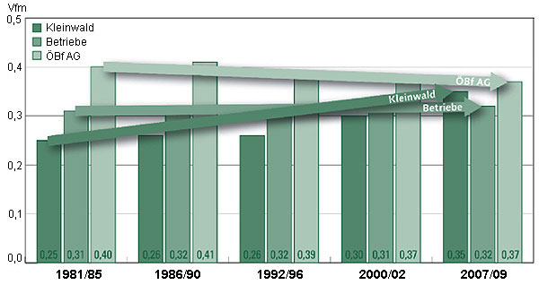Insgesamt scheinen sich diese Mittelstammvolumina auf einen von der Eigentumsart unabhängigen Wert hin zu entwickeln, denn derzeit beträgt dieser Wert im Kleinwald 0,35 Vfm, bei den Betrieben 0,32 Vfm und bei der ÖBf AG 0,37 Vfm.