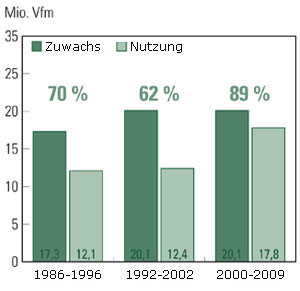 Die Zufallsnutzung von 2,5 Mio. Vfm/Jahr hat sich im ersten Jahrzehnt dieses Jahrhunderts gegenüber den 90-iger Jahren aus bereits angeführten Gründen mehr als verdreifacht. Die planmäßigen Nutzungen haben um mehr als ein Viertel von 11 Mio. auf 14 Mio. Vfm/Jahr zugenommen, die Holzmenge der im selben Zeitraum abgestorbenen Fichten hat sich mehr als verdoppelt.