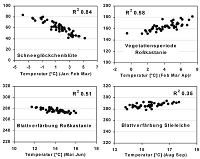 Für Deutschland konnte anhand von Monatsmitteln der Lufttemperatur und der mittleren Eintrittstermine gezeigt werden, dass für Frühjahr- und Sommerphasen die Lufttemperaturen bis zu drei Monate vor deren Eintritt ausschlaggebend sind und bis zu 90 Prozent der Variation erklären. Die untersuchten Phasen verfrühen sich zwischen 2,5 und 6,7 Tagen pro Grad Celsius Erwärmung im Frühjahr. Der Zeitpunkt der herbstlichen Laubverfärbung in Deutschland dagegen ist wesentlich schlechter durch Umweltfaktoren zu erklären, sogar zwei entgegengesetzt gerichtete Temperaturfaktoren wirken: Ein warmer Spätsommer verzögert, höhere Temperaturen im Mai und Juni verfrühen dagegen die Laubverfärbung. Die Länge der Vegetationsperiode in Deutschland lässt sich je nach untersuchter Laubbaumart etwa zur Hälfte mit den Monatsmitteltemperaturen von Februar bis April erklären (Abb. 2).