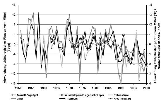 Die phänologische Reaktion von Pflanzen auf veränderte Temperaturen spiegelt sich auch im Tierreich wider. In Abb. 3 sind die Ergebnisse phänologischer Beobachtungen an Vögeln und Pflanzen sowie mittlere Frühjahrstemperaturen in Deutschland gegenübergestellt. Andere Beispiele aus der Tierwelt betreffen beispielsweise die Erstbeobachtung von Schmetterlingen oder das Laichen verschiedener Amphibienarten (z. B. des Laubfrosches), die an vielen Stellen nun früher beobachtet werden. Eine Vielzahl von Vogelarten in Europa und Nordamerika brütet im Mittel 6 bis 14 Tage früher als noch vor 30 Jahren. Bei den Zugvogelarten in unseren Breiten wird in den letzten Jahrzehnten ein zunehmend späterer Wegzug, ein früherer Heimzug, eine Verkürzung der Zugstrecken oder häufigeres Überwintern im Brutgebiet beobachtet. So kommen Zugvögel nun um 1,3 bis 4,4 Tage pro Dekade früher an (Walther et al. 2002).