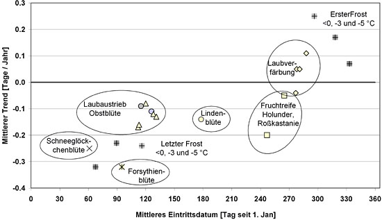 Abb. 4: Mittlere Trends ausgesuchter phänologischer Phasen (nach Menzel 2002) und des letzten bzw. ersten Frostes (nach Menzel et al., submitted) in Deutschland.