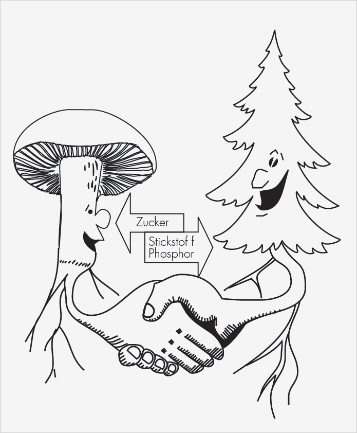 Streu- und holzabbauende Pilze helfen mit, Blätter, Nadeln und Holz abzubauen und deren Inhaltsstoffe wieder in den Nährstoffkreislauf zurückzuführen. Ebenso wichtig für das Ökosystem Wald sind diejenigen Pilze, die mit Waldbäumen in einer engen Lebensgemeinschaft leben (Abb. 1), die sogenannten Mykorrhizapilze. Diese Symbiose dient beiden Partnern – dem Baum wie dem Pilz.