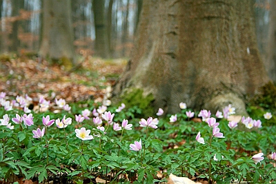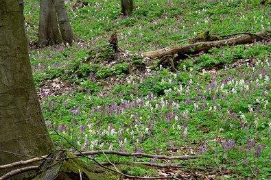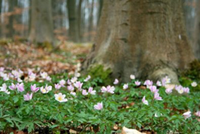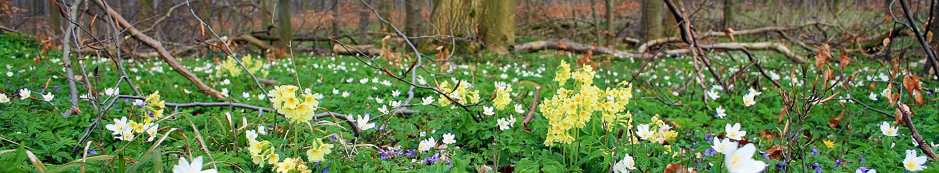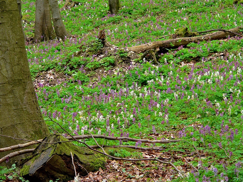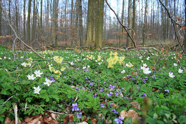 Bei Spaziergängen unter der noch schüchternen Frühjahrssonne sollte der Blick daher häufiger nach unten als in die noch kahlen Baumkronen schweifen. Im braunen Laub des Vorjahres tauchen, motiviert durch die steigende Temperatur im Oberboden, zunächst winzige grüne Blätter und erste bunte Blüten auf. Kurze Zeit später sorgen weiße Teppiche aus Buschwindröschen (Anemone nemorosa), gemischt mit schwefelgelben Waldschlüsselblumen (Primula elatior), dottergelbes Scharbockskraut (Ranunculus ficaria)und blaue Leberblümchen (Hepatica nobilis), violette Veilchen (Violaceae) und ein vielfarbiger Lerchensporn (Corydalis cava) für eine einzigartige Waldatmosphäre, gegen die das satte Grün des Sommers fast langweilig erscheint.
