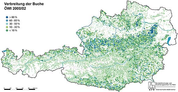 Insgesamt kommt die Buche auf 330.000 ha als Leitbaumart vor, häufiger ist sie jedoch beigemischt oder nur in der Verjüngung vorhanden. Abbildung 2 gibt die Verbreitung nach dem Überschirmungsanteil im begehbaren Wald ohne Holzboden außer Ertrag wieder.