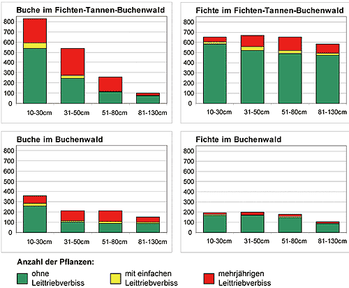 Im Buchenwald, dem Wuchsoptimum der Buche, kommen aber immerhin etwa gleich viel unverbissene Buchen in die vierte Höhenklasse (81-130 cm) wie Fichten. Im Fichten-Tannen-Buchenwald hingegen sind in der vierten Höhenklasse sechsmal mehr Fichten als Buchen anzutreffen. Während also im Bergmischwald die Fichte durch Verbiss praktisch nicht behindert wird, in die oberen Höhenklassen einzuwachsen, gelingt dies nur etwa einem Achtel der Buchen.