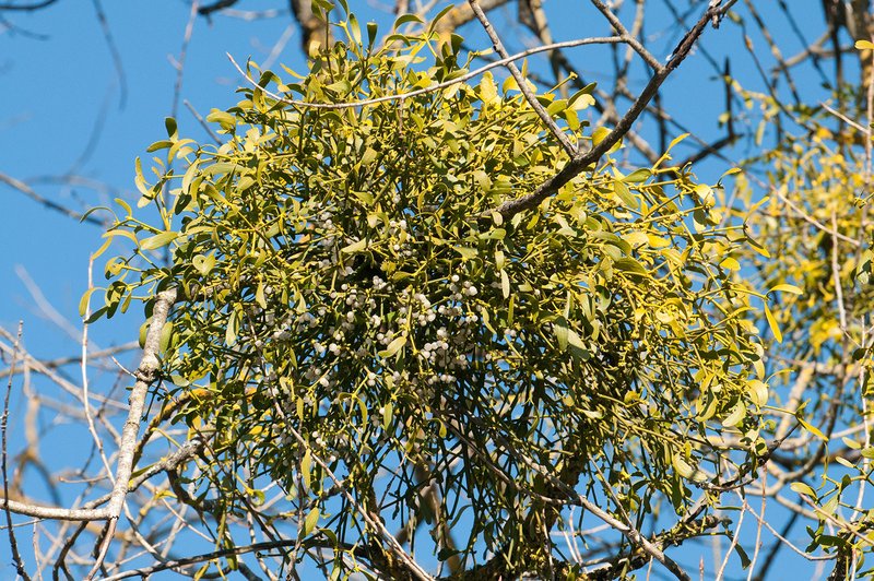 Die grünen Blätter der Gemeinen Mistel deuten es an. Die Mistel deckt, wie jede andere Pflanze auch, selbst den Großteil ihres Nährstoffbedarfs aus der Photosynthese. Wasser und Bodennährstoffe lässt sie sich allerdings von dem Wirt, auf dem sie wächst, bis in die Höhe transportieren. Durchmesser von bis zu einem Meter können die "grünen Büsche" in der Krone der Bäume erreichen. In Mitteleuropa unterschiedet man drei Unterarten. Die Lauholzmistel besiedelt zahlreiche Baumgattungen. Neben Waldbäumen wie Linde und Pappel sind häufig auch Obstbäume wie Apfel betroffen. Bei der Tannenmistel und der Kiefernmistel verraten die Namen bereits die entsprechenden Wirte. Bemerkenswert ist, dass auf der Buche keine Misteln wachsen.