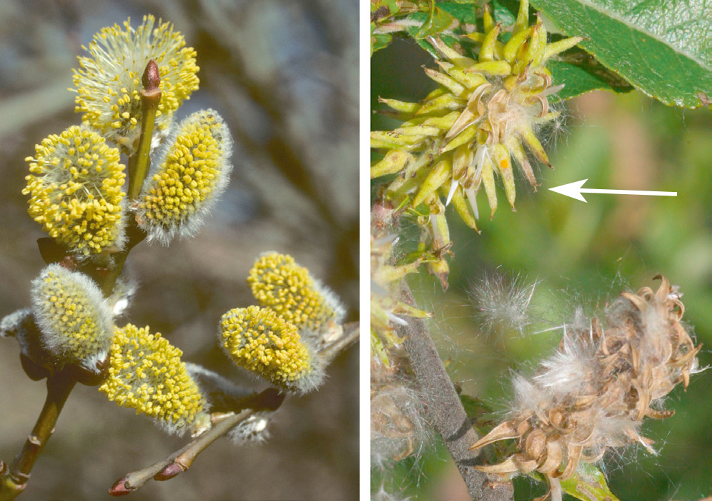 Bei den meisten Weidenarten besteht die männliche Einzelblüte aus zwei Staubblättern. Ausnahmen sind z.B. die Mandelweide (Salix triandra) mit drei und die Lorbeerweide (S. pentandra) mit meist fünf Staubblättern. Die weiblichen Blüten bestehen aus einem flaschenförmigen Fruchtknoten mit mehreren Samenanlagen. An der Spitze des sich nach oben verengenden Fruchtknotens befindet sich der zweilappige Griffel, über dessen Narbe der Pollen aufgenommen wird (Abb. 2, rechts, weisser Pfeil).